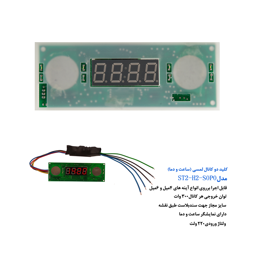 کلید لمسی 2 کانال (ساعت و دما) یکی از پر کاربرد ترین کلید های لمسی رایج در بازار میباشد که زیبایی و جذابیت بسیار بالایی به آینه های هوشمند میدهد .اگر شما برای تولید آینه خود نیاز به کلیدی تمام عیار و حرفه ای دارید ،این محصول   میتواندنیاز شمارا تامین کند و همزمان گرم کن و چراغ پشت آینه را به صورت جداگانه خاموش یا روشن کند